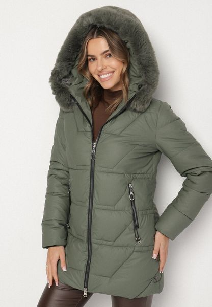 Zielona Długa Kurtka z Pikowanymi Przeszyciami i Kapturem z Odpinanym Futrem Pretinae