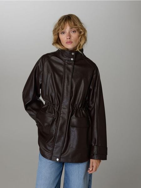 Kurtka o swobodnym kroju, wykonana z imitacji skóry.