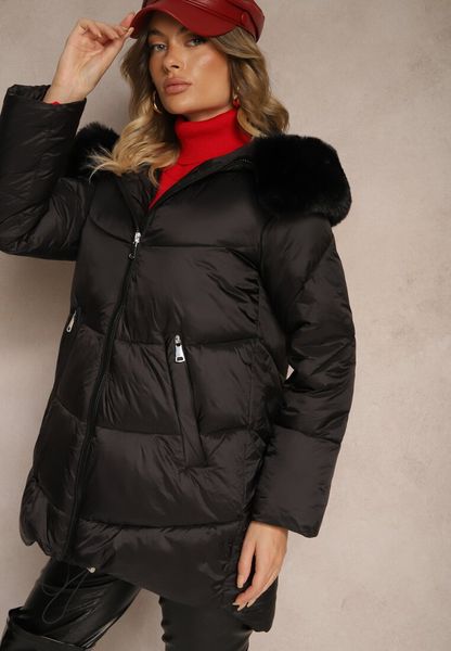 Czarna Pikowana Kurtka z Kapturem Dłuższym Tyłem i Szerokim Futrzanym Kołnierzem Derinna