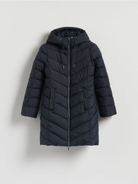 Kurtka o dłuższym kroju, wykonana z gładkiej, pikowanej tkaniny.