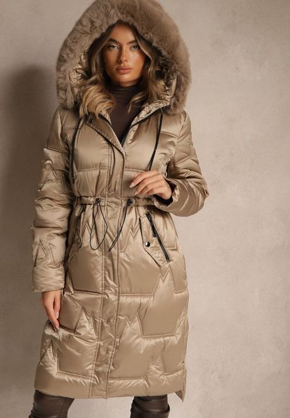 Ciemnobeżowa Długa Kurtka z Pikowanymi Przeszyciami i Kapturem Ściągana w Talii Galeatia