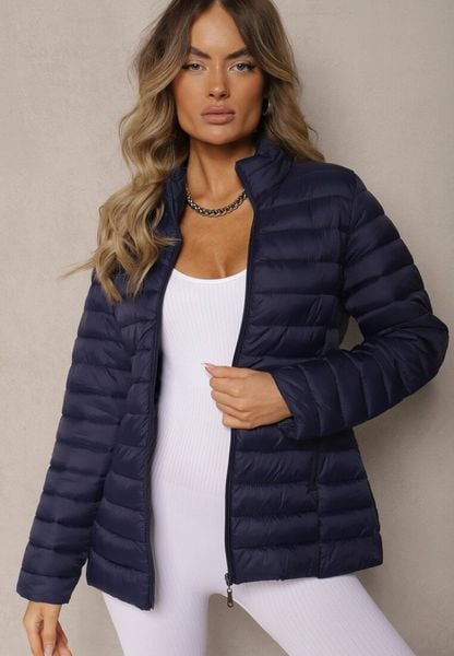 Granatowa Kurtka Ozdobiona Pikowaniem i Kieszeniami na Suwak Mivuria