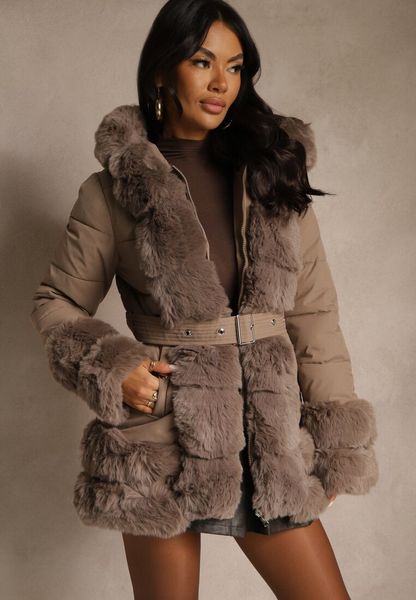 Ciemnobeżowa Kurtka o Taliowanym Kroju z Paskiem Kapturem i Futerkiem Ranalia
