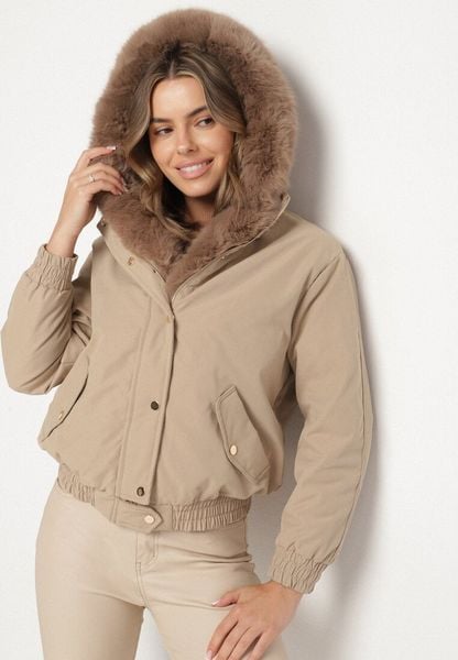 Beżowa Kurtka Bomberka z Futrzanym Obszyciem i Kapturem Rannasa