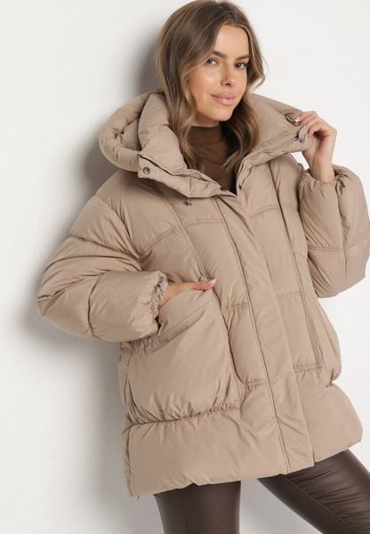 Beżowa Pikowana Kurtka o Kroju Oversize z Kapturem Galandia