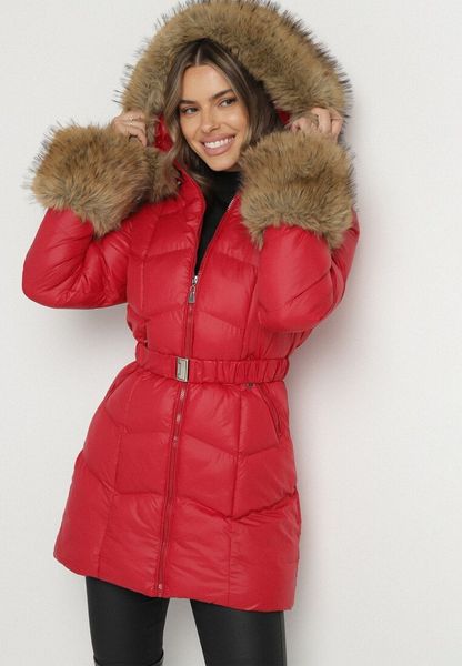 Czerwona Pikowana Kurtka z Paskiem i Kapturem Zdobiona Futerkiem Olunelia