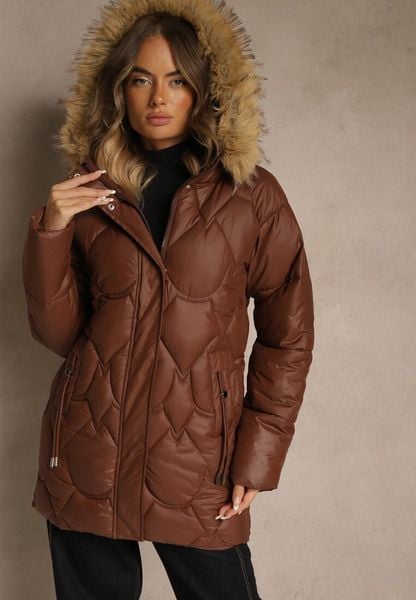 Brązowa Taliowana Kurtka z Pikowanymi Przeszyciami i Kapturem z Futerkiem Olennea