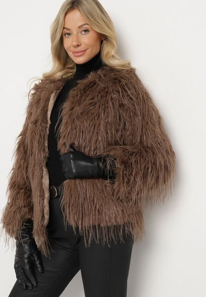 Brązowa Kurtka Futrzana o Prostym Kroju Zapinana na Haftki Siarale