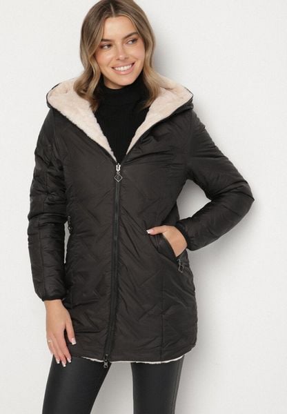 Czarno-Beżowa Pikowana Kurtka Dwustronna z Kapturem i Futerkiem Rinaresa