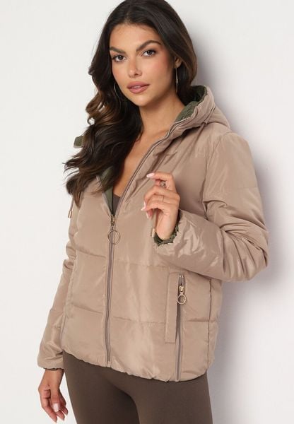 Ciemnobeżowa Dwustronna Pikowana Kurtka z Kapturem Ściągana przy Rękawach Nevelas