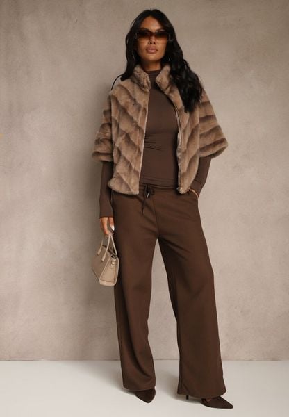 Ciemnobeżowa Trapezowa Kurtka Futerko z Rękawami Długości 3/4 Tadeva
