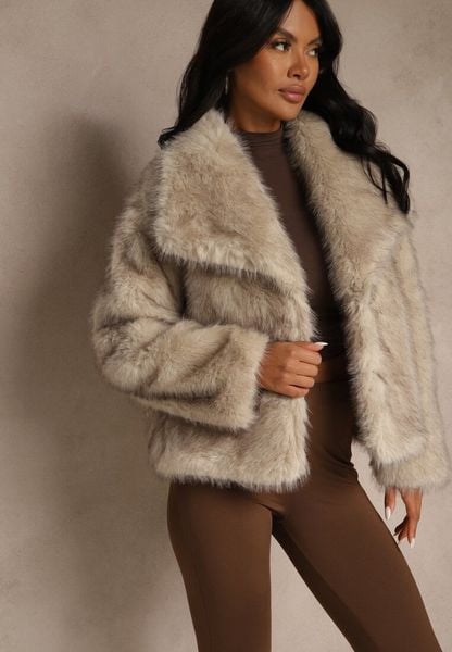 Ciemnobeżowa Kurtka Futrzana Ozdobiona Kołnierzem Avelire