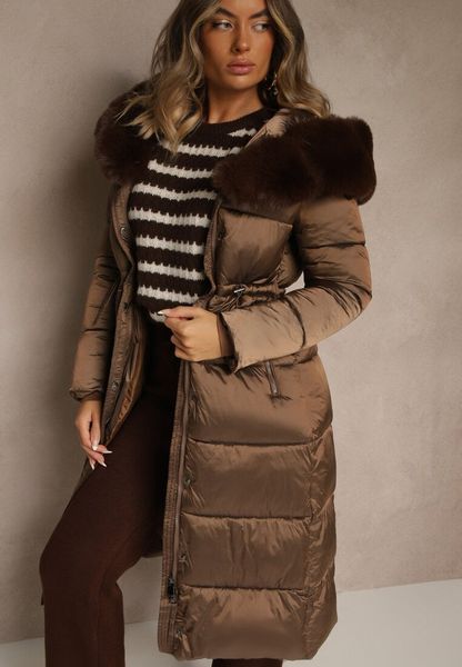 Brązowa Pikowana Kurtka o Długim Kroju Ozdobiona Paskiem i Odpinanym Futerkiem Milirra
