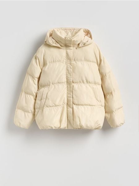 Kurtka o swobodnym fasonie, wykonana z pikowanej tkaniny z wypełnieniem.