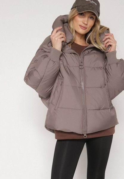 Ciemnobeżowa Pikowana Kurtka o Kroju Oversize z Kapturem Mevisana