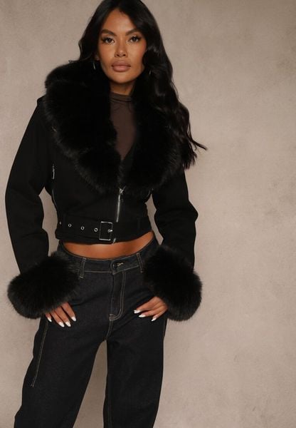 Czarna Kurtka o Kroju Ramoneski z Ociepleniem Zdobiona Futrem Mevindana
