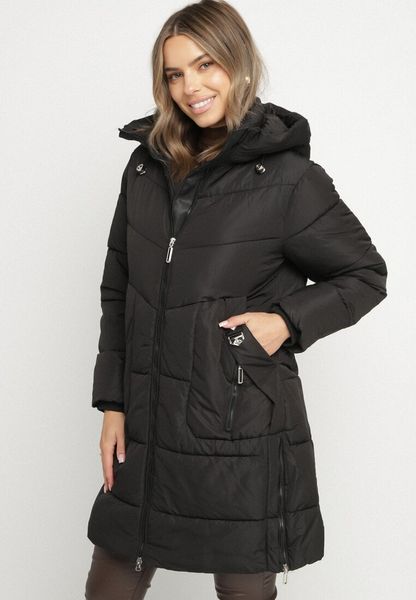 Czarna Kurtka Pikowana z Kapturem i Suwakami po Bokach Lindrie