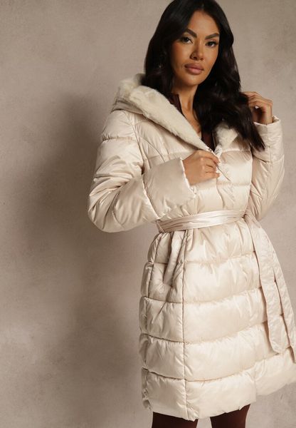 Beżowa Pikowana Kurtka z Nieodpinanym Kapturem o Długim Kroju z Paskiem Lidassea