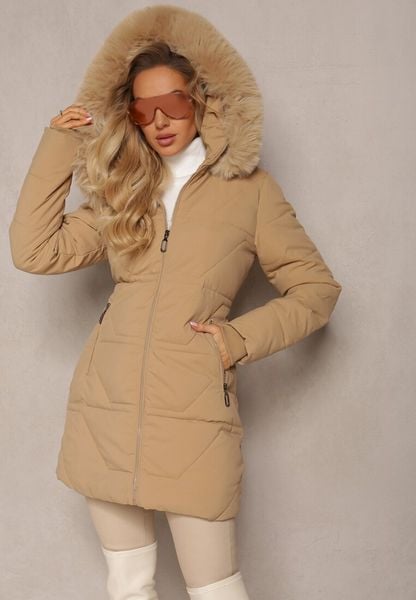 Ciemnobeżowa Pikowana Kurtka z Kapturem i Ozdobnym Futerkiem Zepiola