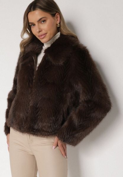 Brązowa Kurtka Futerko o Prostym Kroju z Zapięciem na Suwak Tusiviela