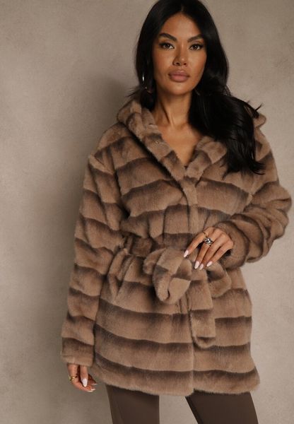 Jasnobrązowa Kurtka Futrzana z Nieodpinanym Kapturem Ozdobiona Paskiem Zetelia
