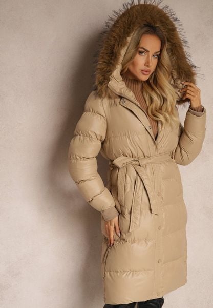 Beżowa Pikowana Kurtka o Długim Kroju z Odpinanym Kapturem z Futerkiem i Paskiem oleti