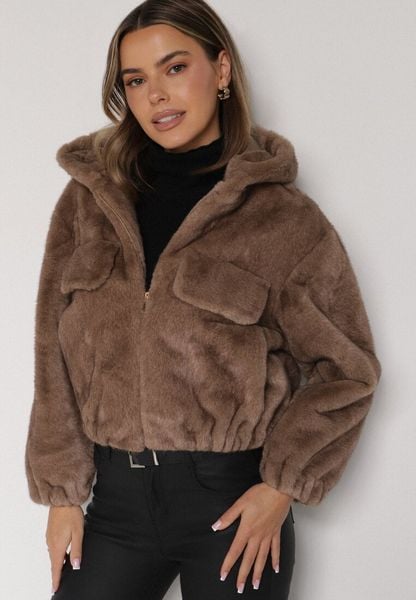 Jasnobrązowa Kurtka Futerko o Kroju Bomberki z Kapturem i Imitacją Kieszeni Awedana