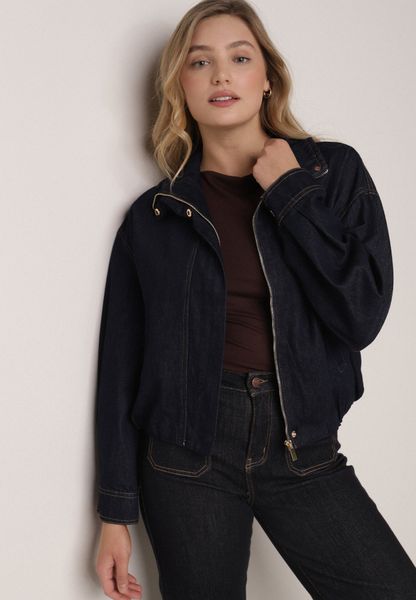 Granatowa Jeansowa Kurtka Przejściowa z Bawełny o Kroju Bombki z Kołnierzykiem Jotima