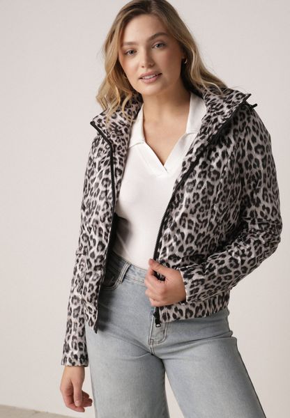 Czarno-Biała Kurtka Przejściowa w Panterkę z Odpinanym Kapturem Antolea