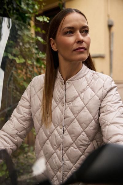Beżowa Dwustronna Kurtka z Pikowanymi Przeszyciami i Odpinanym Kapturem Zelirelle