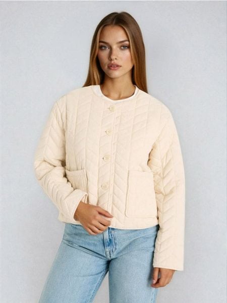 Pikowana kurtka w jodełkę zapinana na guziki – kremowy