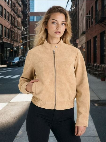 Kurtka z imitacji zamszu ze stójką zapinaną na zatrzask – beżowy