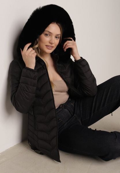 Czarna Pikowana Kurtka Przejściowa z Kapturem i Ściągaczami po Bokach Fezika