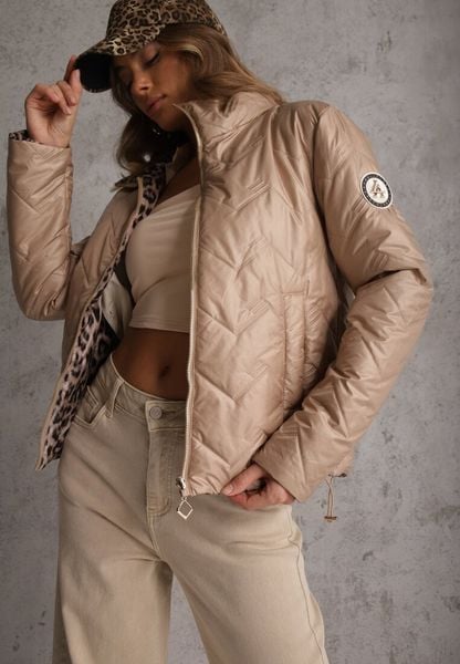 Ciemnobeżowa Pikowana Kurtka Dwustronna z Motywem Panterki i Naszywką Damike