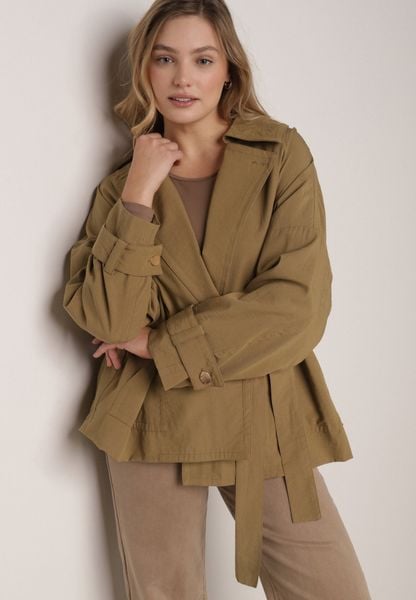 Zielona Bawełniano-Wiskozowa Kurtka Typu Krótki Trencz z Ozdobnym Guzikiem Dafena