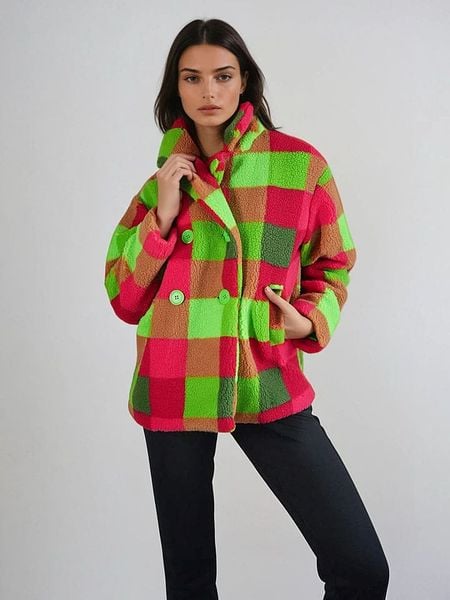 – kołnierzyk: z klapami- zapięcie: dwurzędowa listwa guzikowa- kieszenie: wpuszczane- krój: luźny- wzór: kratka