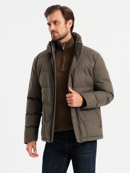 Męska kurtka casualowa puffer z wełną – ciemnooliwkowy melanż V4 – Rozmiar: S