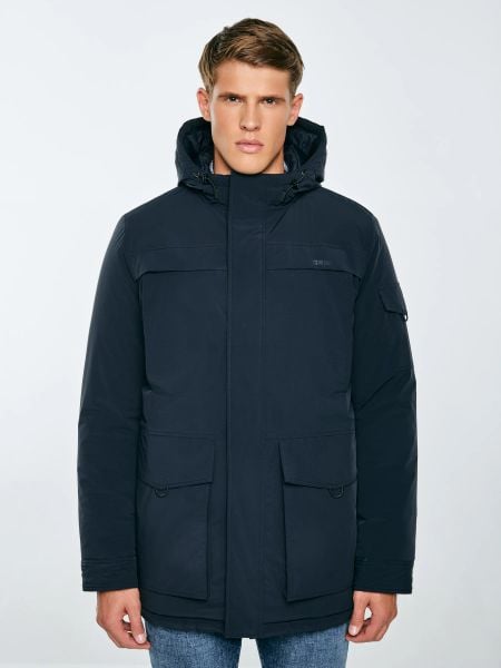 Kurtka męska puchowa z naturalnym wypełnieniem z kapturem granatowa Eurico 404