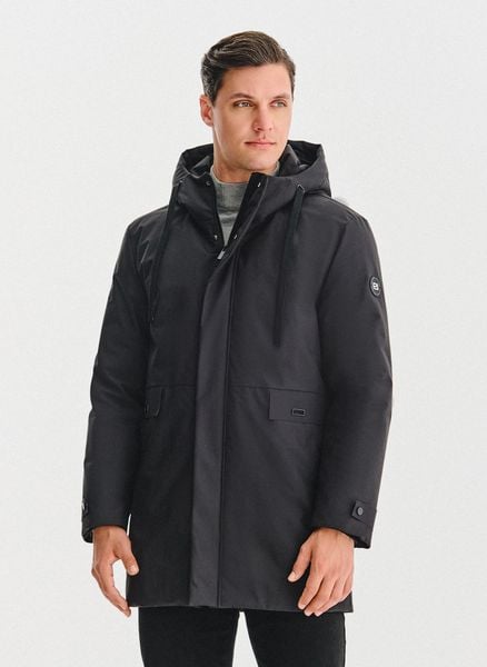 Puchowa kurtka męska – Pako Lorente. Długa kurtka męska na sezon jesienno-zimowy. Puchowa kurtka z kapturem w kolorze czarnym. Skład: 100% poliester. Wypełnienie: 90% puch, 10% pierze. Podszewka: 100% poliester.