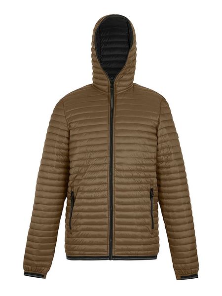 Lekka męska kurtka z łączonych materiałów z kapturem i ozdobnym pikowaniem – jasnobrązowa V2 - Rozmiar: M
