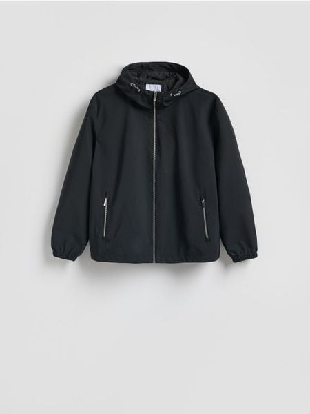 Kurtka o prostym kroju, wykonana z tkaniny o podstawowej wodoodporności.