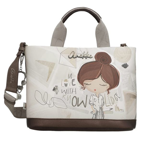 Torebka damska Anekke, z dekoracyjnym nadrukiem i metalowym logo z podwójną rączką oraz regulowanym paskiem zapinana na zamek, brązowa, 42801-222