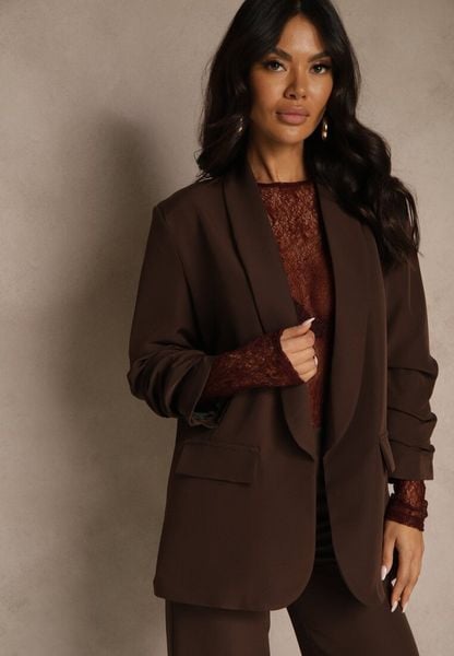 Brązowa Pudełkowa Marynarka Bez Zapięć z Wiskozą z Marszczonymi Rękawami Fenidia