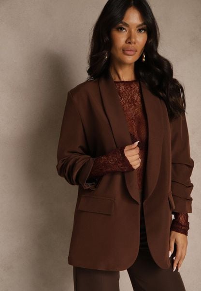 Brązowa Pudełkowa Marynarka Bez Zapięć z Wiskozą z Marszczonymi Rękawami Fenidia
