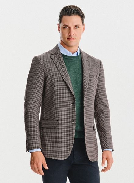 Wełniana marynarka w kratę – Pako Lorente. Ciemna marynarka męska. Fason: Slim. Brązowa marynarka w drobną kratę. Skład: 70% poliester, 30% wełna.