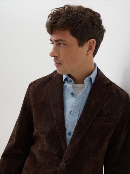 Marynarka o regularnym kroju, wykonana z zamszu.