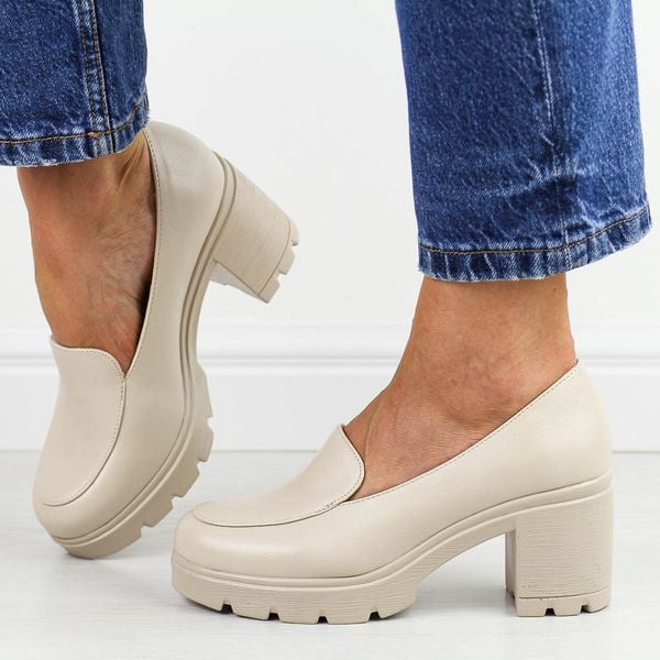Beżowe pu mokasyny damskie na słupku Potocki 12040