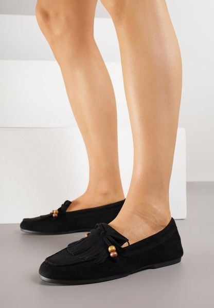 Czarne Mokasyny z Koralikami Kokardą i Frędzlami Nahda