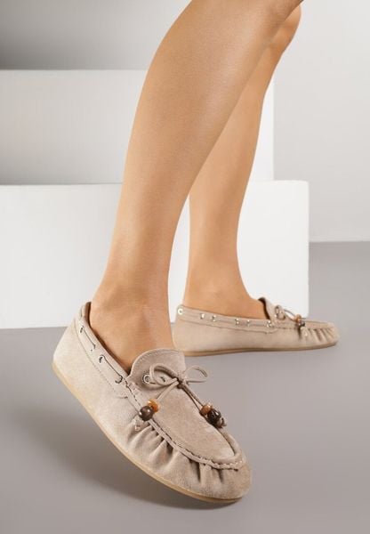Ciemnobeżowe Mokasyny z Ozdobnymi Przeszyciami Koralikami i Kokardą Mountainthorne