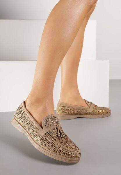Ciemnobeżowe Mokasyny Ozdobione Cyrkoniami i Aplikacjami Isirsyss